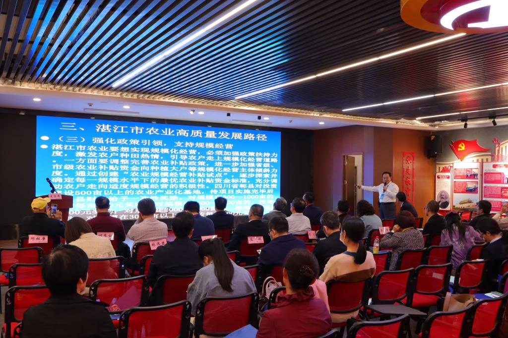 闫玉科教授以“湛江市农业高质量发展路径探析”为题做了专题报告。报告概述了湛江市农业发展取得的主要成绩,系统分析了湛江农业发展存在的农业生产效率低、高标准农田占比低、全国名特优新农产品覆盖率低、产业融合程度低和养殖成本高等“八低一高”现象和新型农业经营主体待培育等问题,提出了转变观念树立新理念,充分发扬“三牛”精神,加强政策引领,强化科技支撑,深入推进产业融合发展,实施特色农产品品牌发展战略等对策建议。报告受到了与会人员的高度评价,引发了热烈讨论。