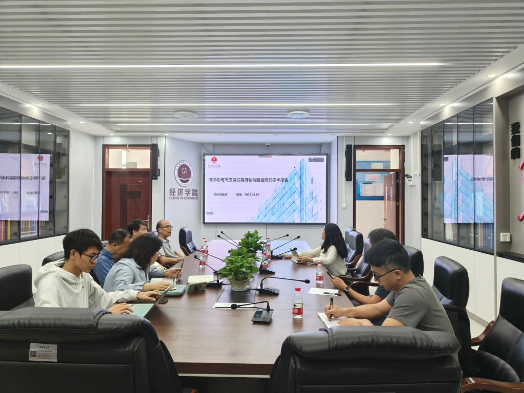 王舒鸿教授从三个方面展开报告,首先系统梳理了海洋牧场发展历程,接着深入分析了海洋牧场发展存在的问题,最后提出了数智化转型、扩大海洋消费等海洋牧场高质量发展路径。期间,王舒鸿教授以"耕海一号"为典型案例,生动展示了数字技术在海洋牧场中的创新应用。在交流环节,与会教师就海洋牧场发展效率、研究前沿热点等问题与王舒鸿教授展开深入探讨。大家纷纷表示,王舒鸿教授的报告内容丰富,有很强的针对性和指导性,对今后开展海洋经济研究有启发作用。