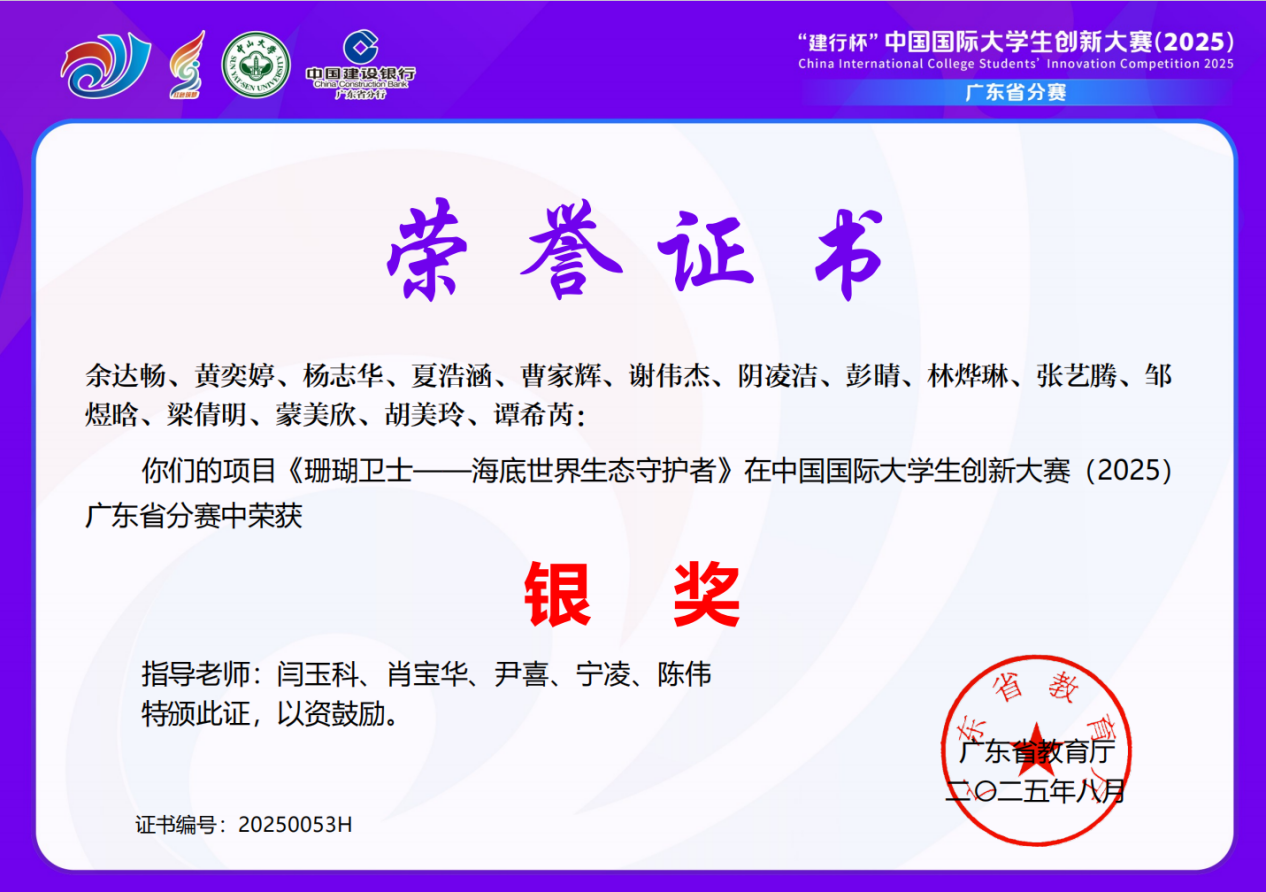 近日,“珊瑚卫士团队”收到中国国际大学生创新大赛(2025)广东省分赛获奖证书。艾弗森贝博ballbet官网珊瑚卫士团队项目《珊瑚卫士——海底世界生态守护者》荣获广东省分赛青年红色筑梦之旅赛道公益组银奖,为学院创新创业教育再添殊荣。