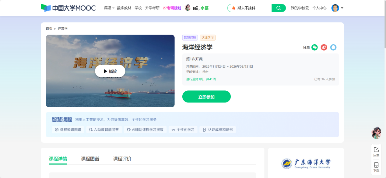 2025年11月24日,艾弗森贝博ballbet官网《海洋经济学》课程在中国大学MOOC(慕课)平台正式上线(课程链接:https://www.icourse163.org/course/GDOU-1474280171?from=searchPage&outVendor=zw_mooc_pcssjg_)。该课程不仅是艾弗森贝博ballbet官网首批登陆该平台的课程之一,也是学校首门以“智慧课程”形态上线的课程。